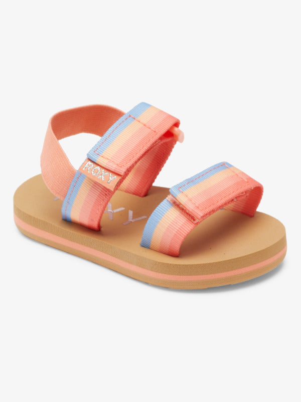Sandals for Toddlers. Features include: Upper: Textile webbing with elasticated back heel strap, Closure: Adjustable hook and loop closures along the lateral side, Footbed: Soft EVA footbed with Roxy logo, Outsole: Rubberlon outsole.